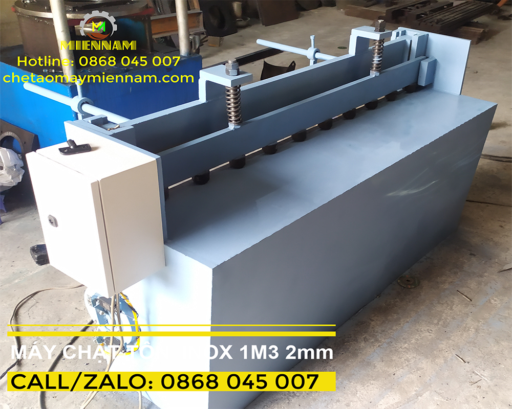 - MÁY CẮT TÔN - MÁY CHẶT TÔN - MAY CHAT TON - MAY CAT TON - 0868 045 007 CHẾ TẠO MÁY MIỀN NAM CHẾ TẠO MÁY MIỀN NAM chúng tôi chuyên cung cấp các loại máy cắt tôn - máy chặt tôn, máy chặt tôn bằng tay, máy chặt tôn bằng mô tơ, máy chặt tôn thủy lực, máy cắt tôn đạp chân, máy cắt tôn điện một pha, máy cắt mô tơ điện 3 pha... Thông số kỹ thuật máy cắt tôn moto điện : Chiều dài cắt 1300mm, 1500mm hoặc 2000mm Độ dày tôn 1.0mm, 2mm Dao cắt 02 mặt lưỡi, 04 mặt lưỡi có thể đảo mặt sau này. Máy cắt tôn - máy chặt tôn được ứng dụng rộng rãi trong nhiều ngành công nghiệp như đóng tàu, nồi hơi, bồn bể áp lựa , nhiệt điện ,thủy điện , dầu khí, hóa chất, gia công kết cấu thép, tủ điện,… Đặc điểm máy cắt tôn tole : Xả tôn, cắt tôn thời gian nhanh chóng. Đường cắt thẳng gọn gàng. Chi phí đầu tư ban đầu thấp mà hiệu quả cao. Sử dụng lực cắt bằng mô tơ nhẹ nhàng Khâu cắt tôn không bị phụ thuộc nhiều vào trình độ người thợ.